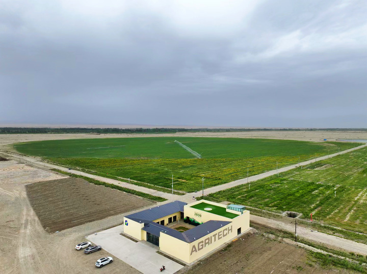 近日,记者前往位于莎车县亚喀艾日克乡的一片戈壁滩。戈壁滩上长出绿意盎然的苜蓿、油菜和向日葵。两个面积共1700亩的巨大绿色圆形地带与周围黄褐色的戈壁滩形成鲜明对比,植被生机一扫戈壁荒芜。