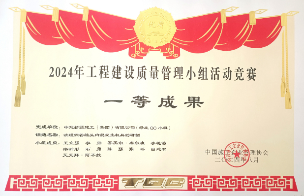 近日,中国施工企业管理协会主办的“2024年工程建设质量管理小组活动竞赛”在山西太原落下帷幕。中建新疆建工四建(以下简称“四建”)绿色建筑发展经理部的《清理钢管端头内混凝土机具的研制》获得国家级QC成果“一等成果”。这是该成果获得中建集团2024年QC成果“一等奖”、自治区QC成果“Ⅰ类成果”后的又一殊荣。