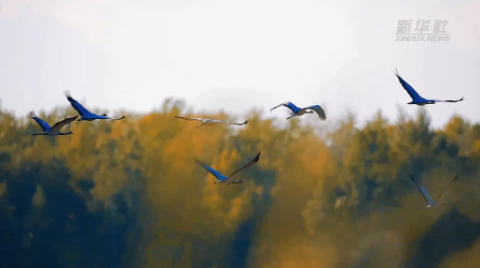 9月,在新疆阿勒泰市一处湿地,白鹭、蓑羽鹤等候鸟在此觅食、嬉戏,与芦苇、农田构成一幅和谐秀美的生态画卷。
