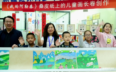 这幅长卷创意策划人是新疆润疆国画院院长魏宝山。他说,9月7日,《我的阿勒泰》桑皮纸上的儿童画长卷创作在乌鲁木齐市启动,30位各族少年儿童学习了解非遗桑皮纸文化,参加现场创作。