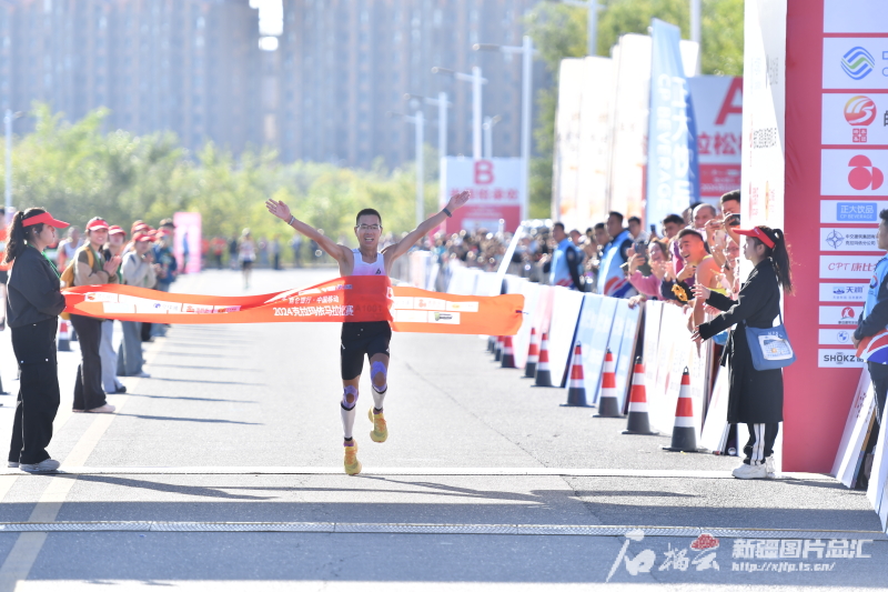 9月16日清晨8时,2024克拉玛依马拉松赛正式鸣笛开赛,图为全程马拉松参赛选手羊小军冲过终点线。赛事组委会供图