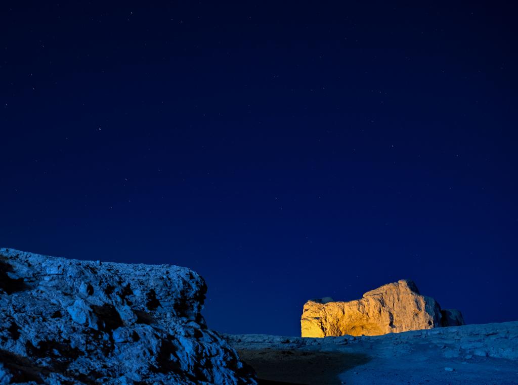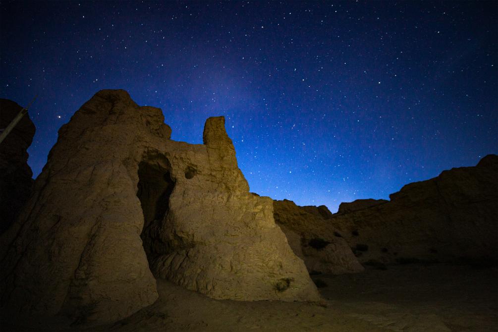 这座城,东汉名将班超来过,唐玄奘西去求取真经时路过,多少汉唐边塞诗人走过……月色下,故城轮廓冷冽清晰,南北向两条大道将居民区、寺院区、仓储区分为两侧,建筑形制与唐代长安城相仿,城市中部是官署区,也是交河故城最高的地方。站在官署区高处,温热的风裹挟着砂砾,吹过身侧,游人好似跨越时空……
