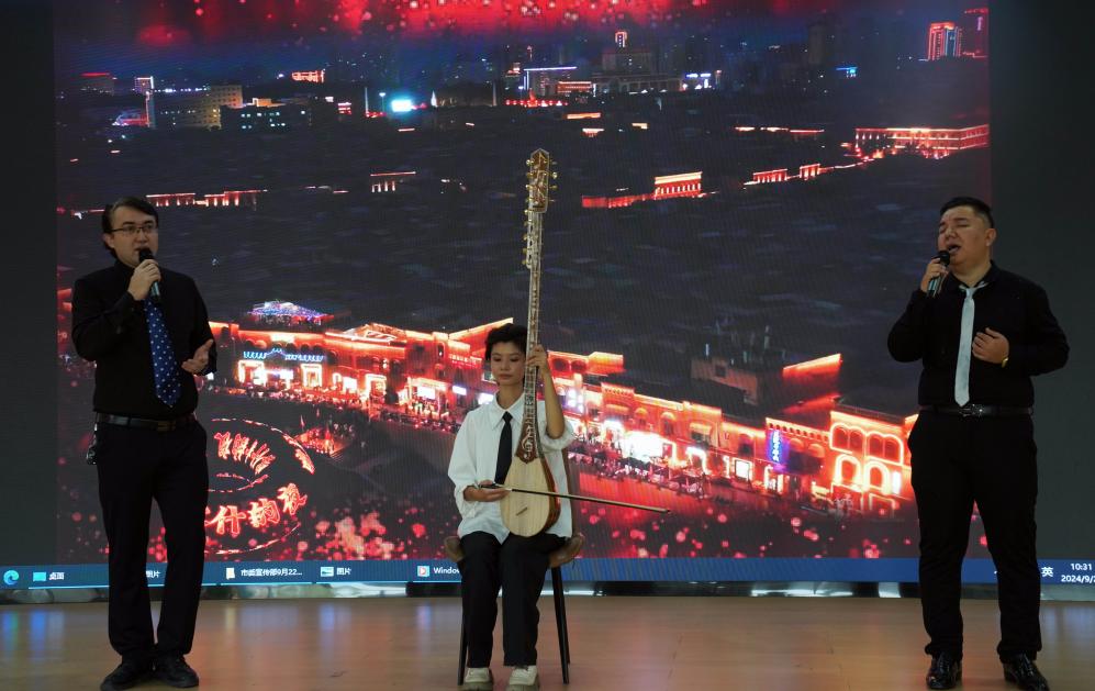 9月22日,在新疆喀什市东湖社区市民中心,社区居民在为即将到来的国庆排练节目。新华社记者 赵宇思 摄