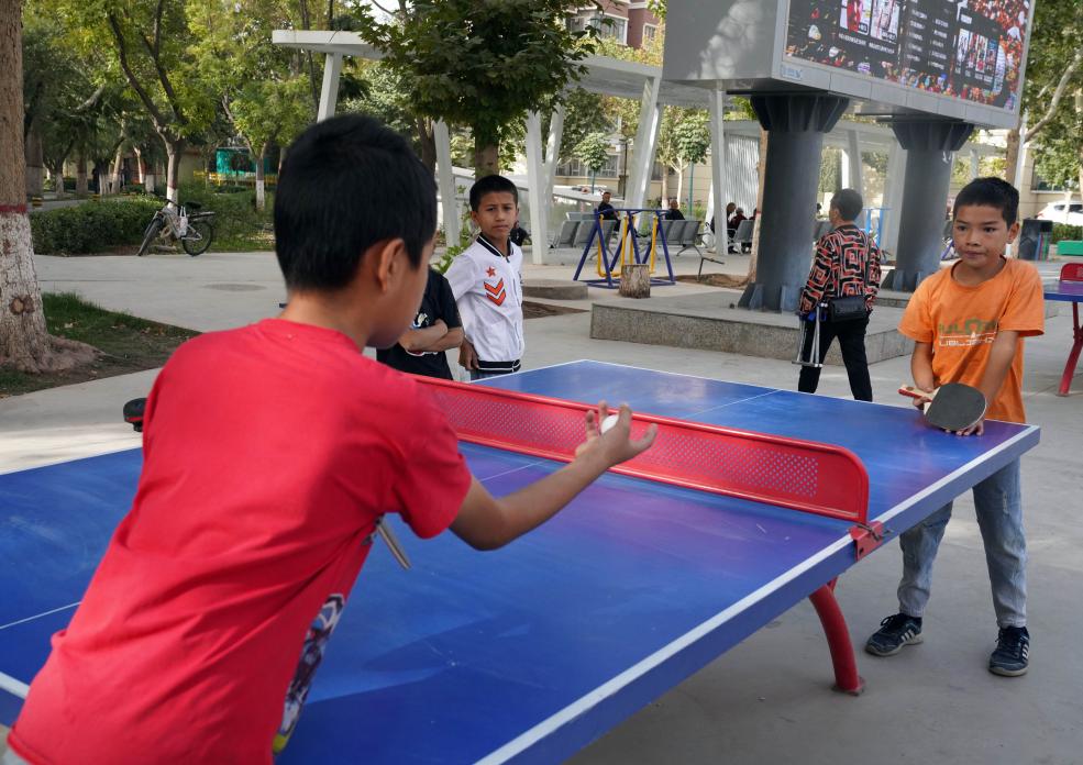 9月22日,在新疆喀什市东湖社区,两名儿童在社区广场打乒乓球。新华社记者 赵宇思 摄