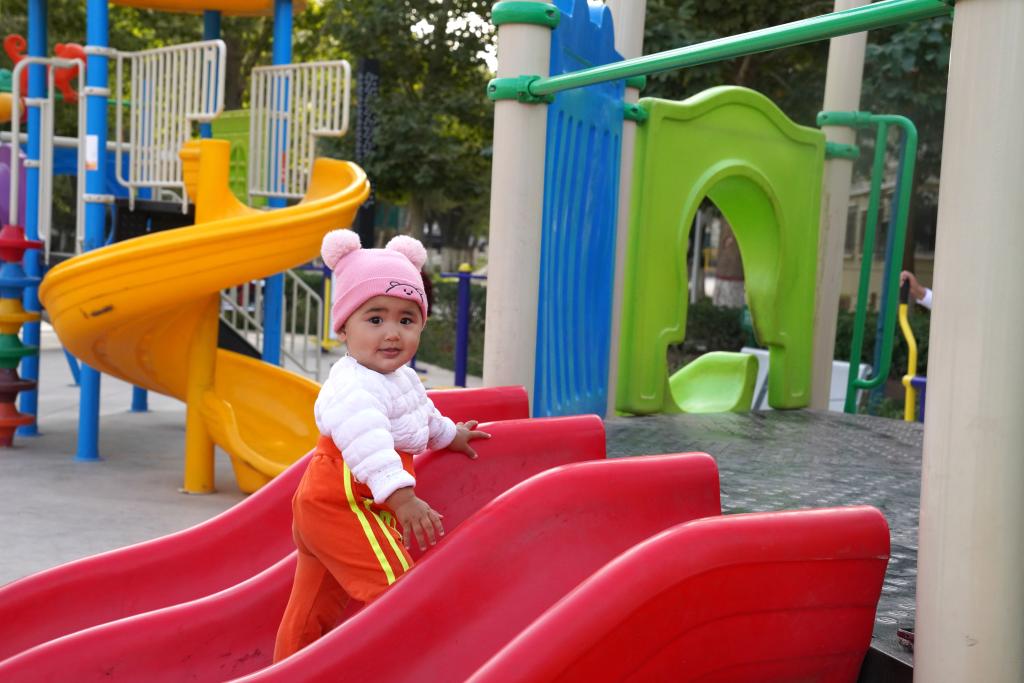 9月22日,在新疆喀什市东湖社区,孩子在社区广场的儿童游乐场玩耍。新华社记者 赵宇思 摄