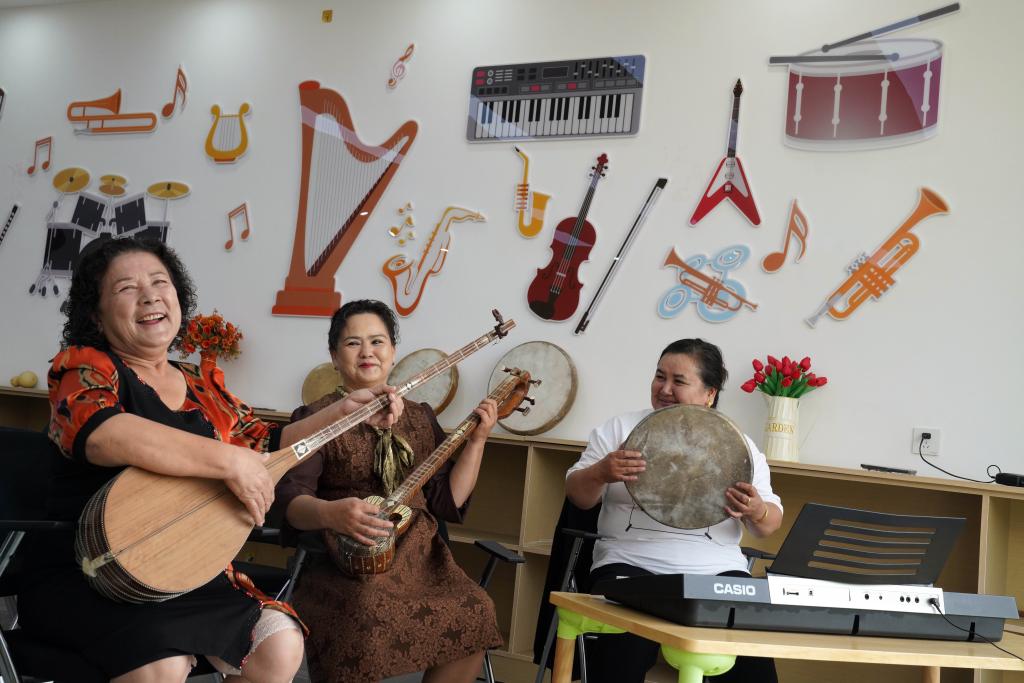 9月22日,在新疆喀什市东湖社区市民中心,社区居民在音乐室练习传统乐器演奏。