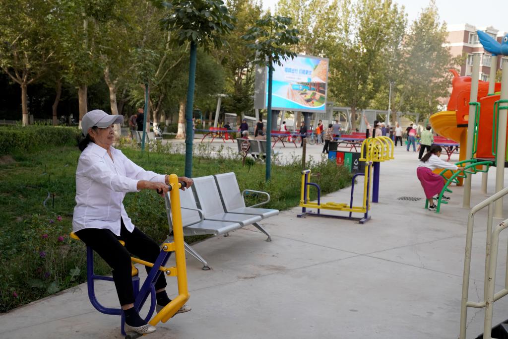 9月22日,在新疆喀什市东湖社区,居民在社区广场使用健身器材晨练。新华社记者 赵宇思 摄