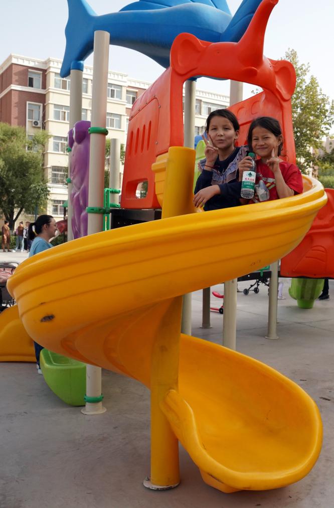 9月22日,在新疆喀什市东湖社区,两名儿童在社区广场的儿童游乐场玩耍。新华社记者 赵宇思 摄