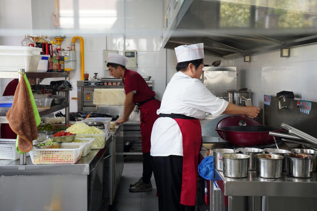 9月22日,在新疆喀什市东湖社区,工作人员在社区“爸妈食堂”准备午餐。“爸妈食堂”在收费上对60岁以上的社区老人有不同程度的补贴,90岁以上社区老人可免费享用一日三餐。新华社记者 赵宇思 摄