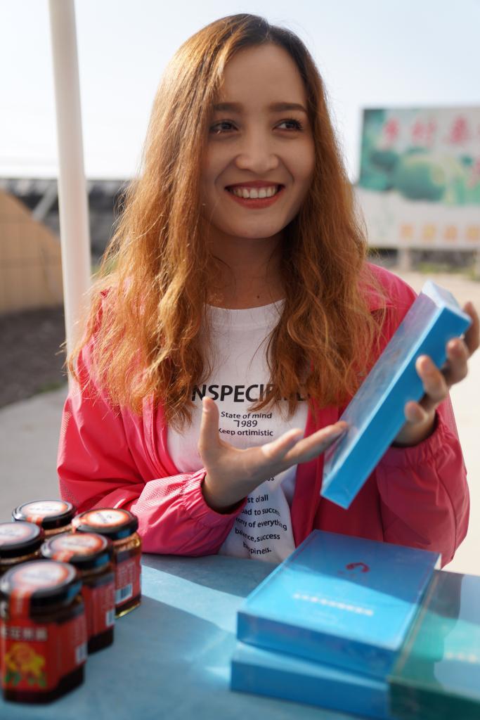 9月24日,在阿图什市上阿图什镇塔库提村设施农业基地,一位维吾尔族工作人员在推介无花果补水面膜。新华社记者 赵宇思 摄