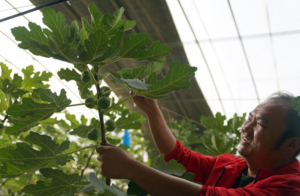 9月24日,在阿图什市上阿图什镇塔库提村设施农业基地,一位工作人员在为无花果修剪侧枝。