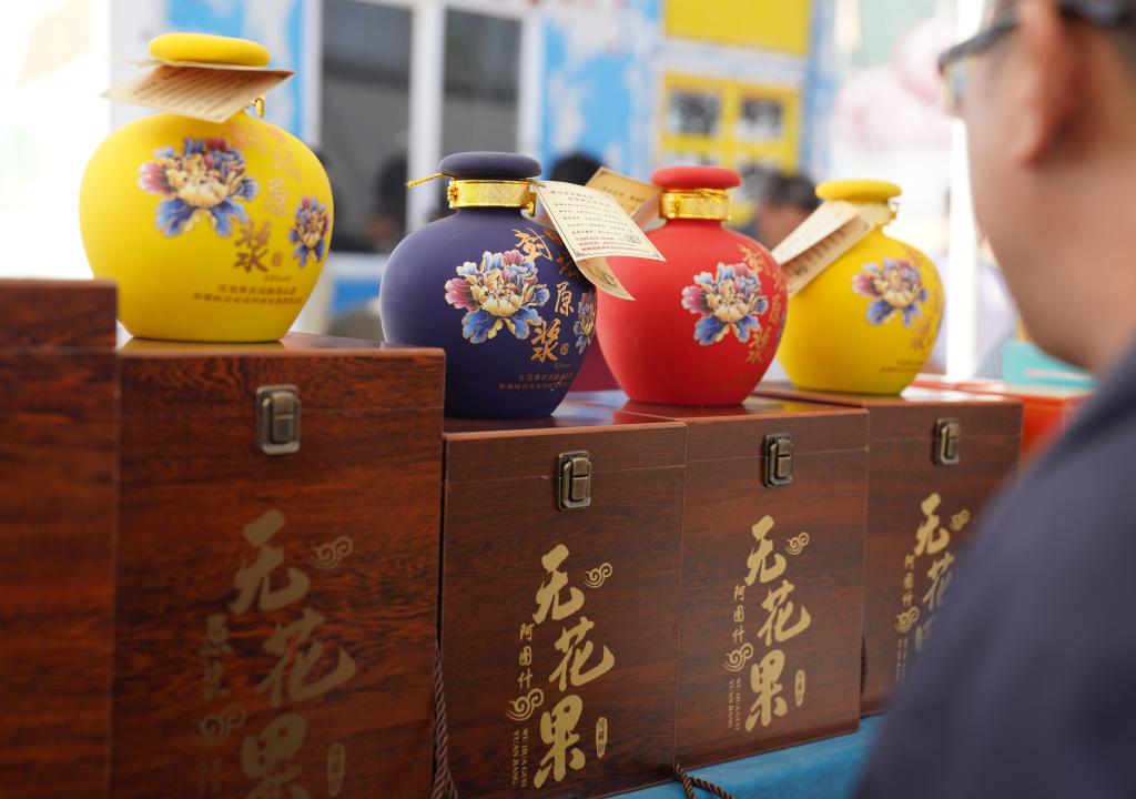 9月24日,在阿图什市上阿图什镇塔库提村设施农业基地,一位参观者在观看无花果酿造的白酒。 新华社记者 赵宇思 摄