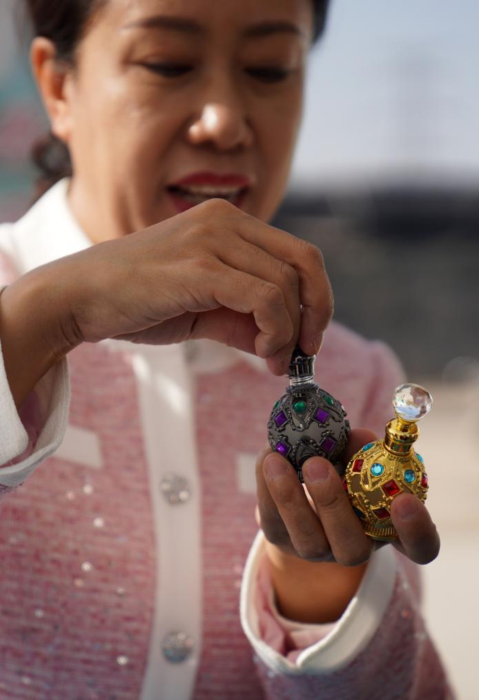 9月24日,在阿图什市上阿图什镇塔库提村设施农业基地,一位工作人员在展示以无花果为原料制造的香水。新华社记者 赵宇思 摄