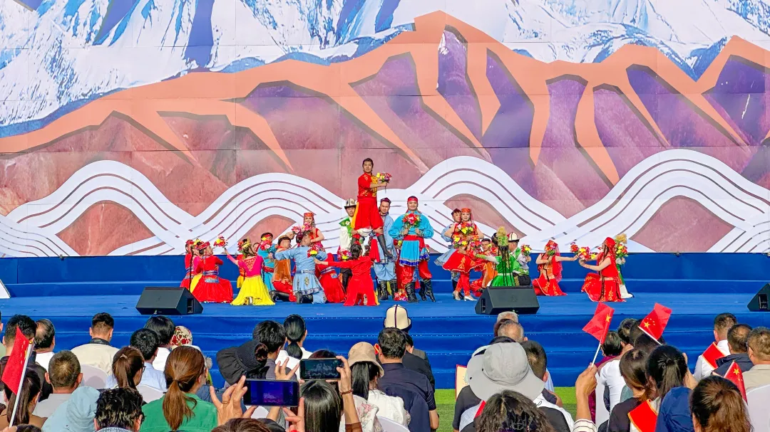 在激昂跃动的序章开场舞《奔向幸福万山之州》中,文艺演出拉开帷幕。歌曲《美丽新疆》、情景剧《布大妈送馕》、器乐合奏《百灵鸟》等精彩纷呈的节目轮番上演,赢得了现场观众阵阵热烈的掌声。情景剧《布大妈送馕》生动呈现了布茹玛汗·毛勒朵大妈守边护边的故事,深情表达了克州各族群众“一生只做一件事,我为祖国守边防”的坚定信念和爱国情怀;歌舞《我的爱献给祖国母亲》、歌曲《大江大河》、歌舞《边疆》等节目,通过娓娓动听的歌曲与优美的舞蹈演艺,展现出克州儿女勠力同心、奋力实现中华民族伟大复兴中国梦的时代担当。