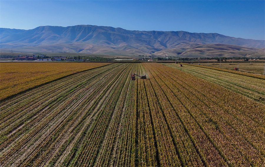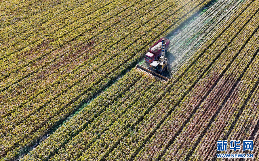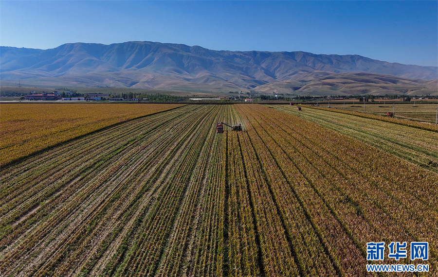 大型收割机在田间来回穿梭,忙着收割制种玉米。