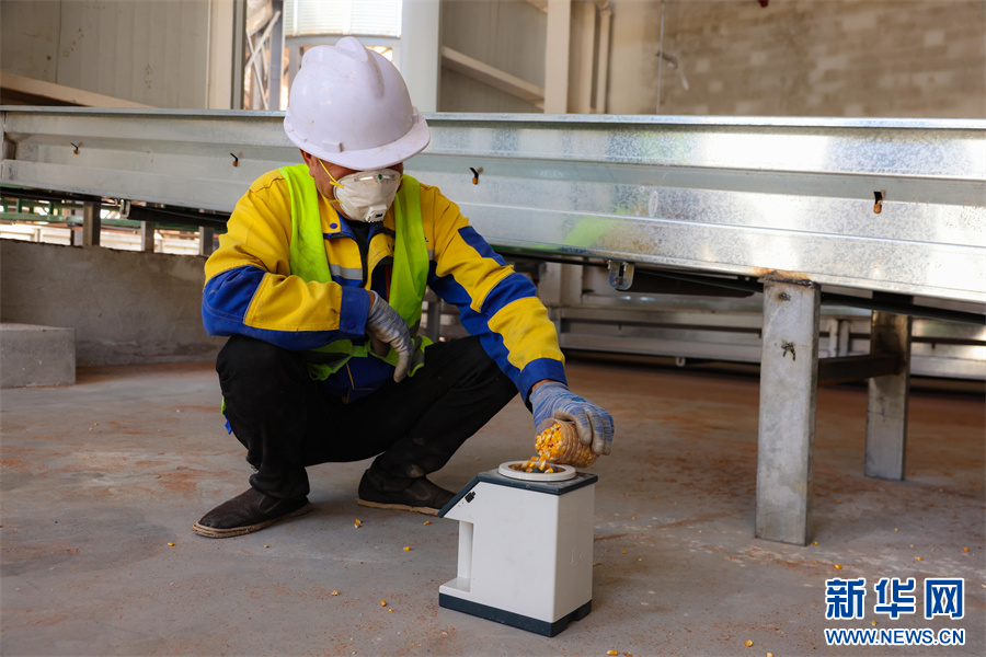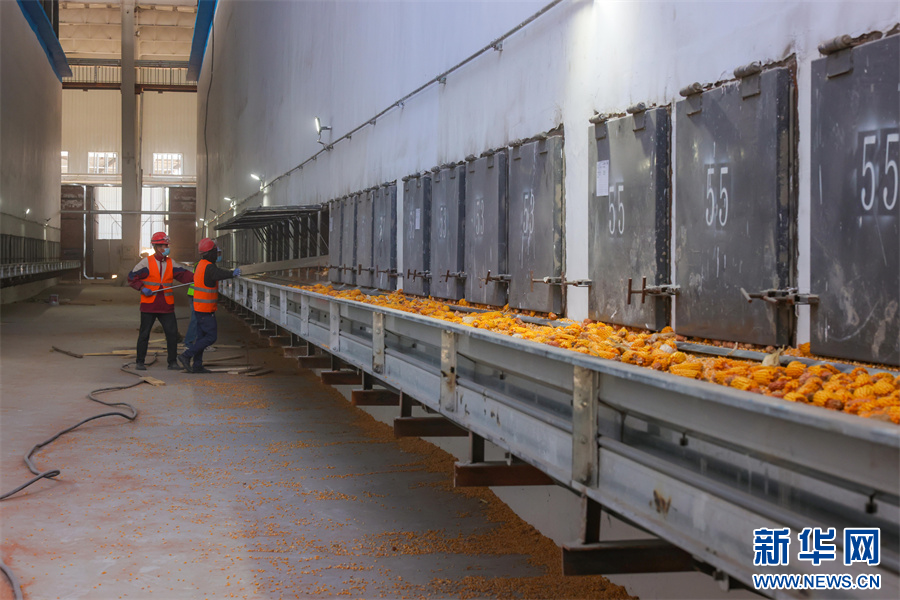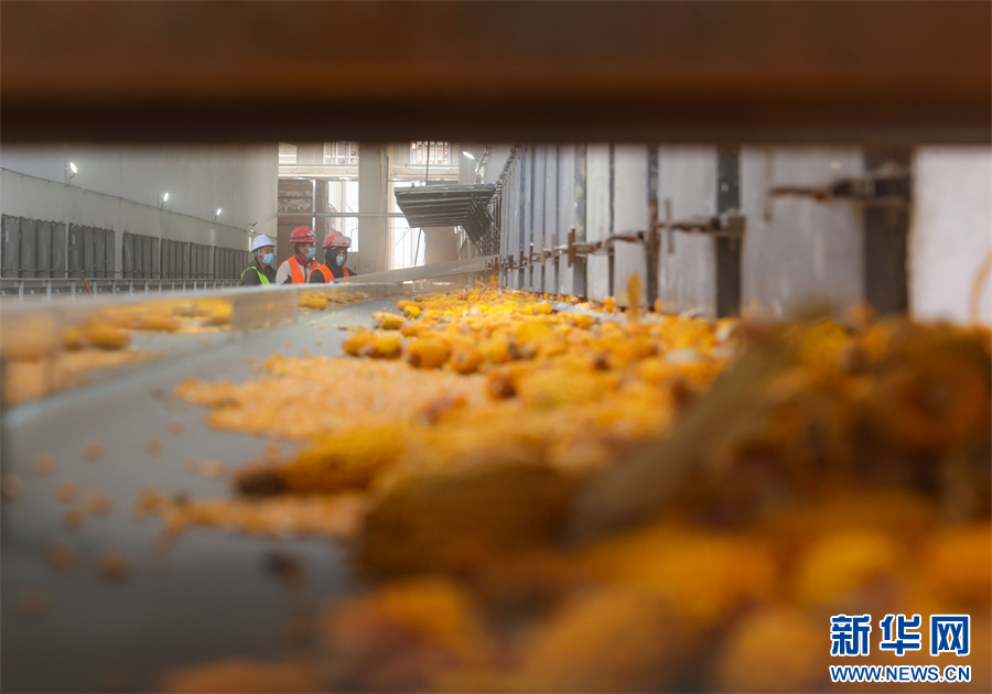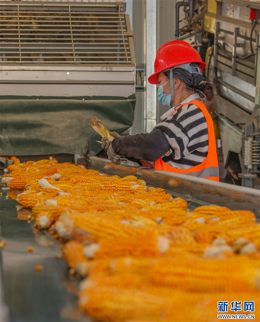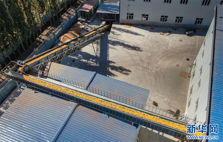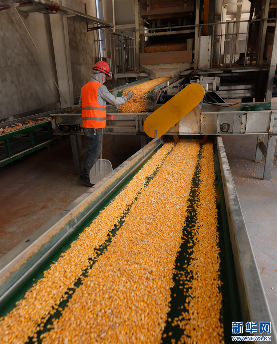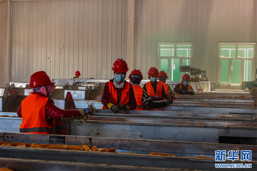 在新源县别斯托别农业产业园中,工作人员正在对收割的制种玉米进行剥皮处理。