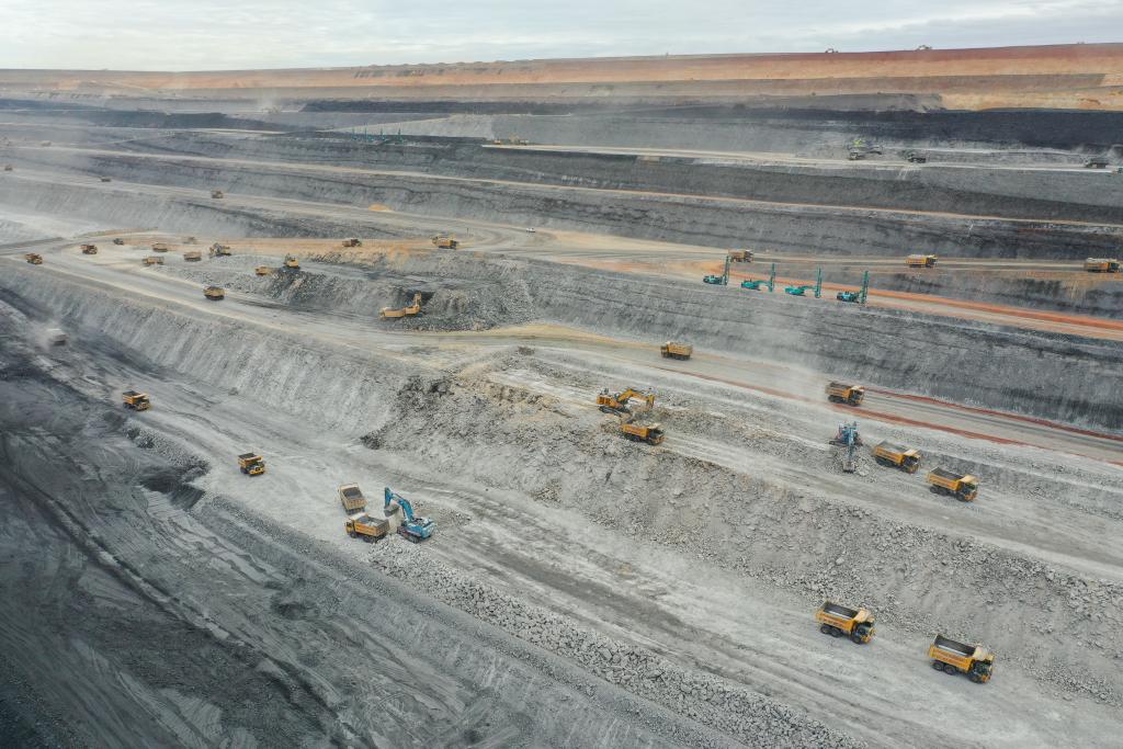 这是在国能新疆红沙泉能源有限责任公司红沙泉一号露天煤矿拍摄的作业现场(9月27日摄,无人机照片)。