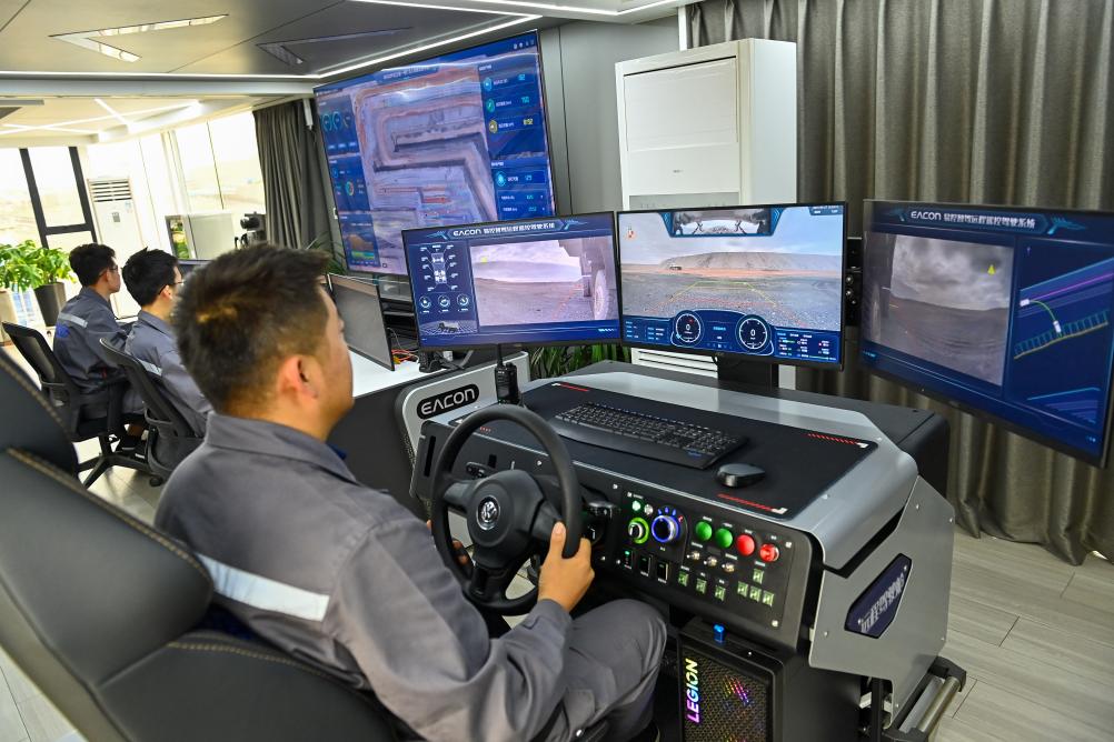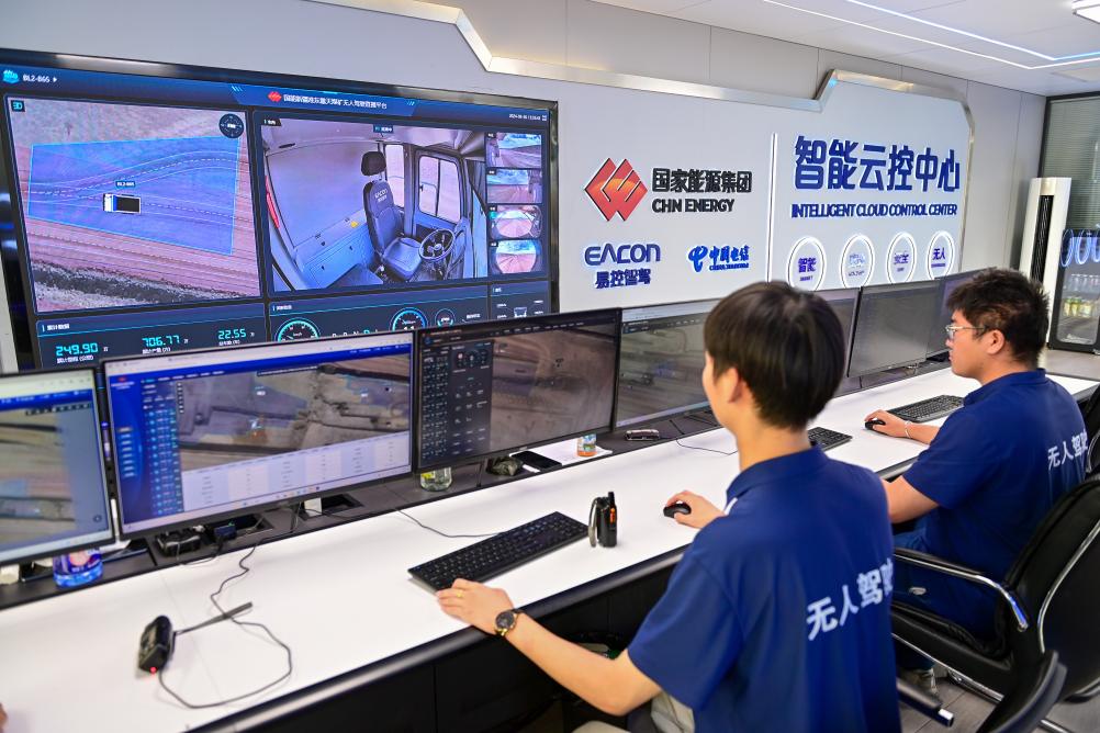在国能新疆准东能源有限责任公司准东露天煤矿智能云控中心,工作人员进行车辆调配、线路规划和监测(9月26日摄)。
