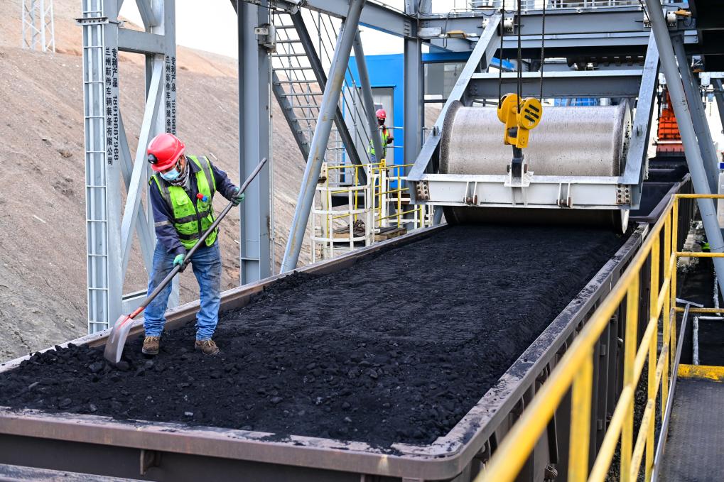 在国能新疆准东能源有限责任公司准东露天煤矿快装站,工作人员将火车上的煤整理平整(9月27日摄)。