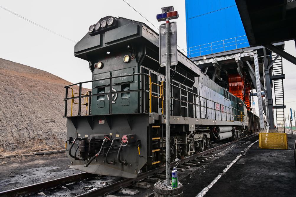 在国能新疆准东能源有限责任公司准东露天煤矿快装站,一列出疆火车在装煤(9月27日摄)。
