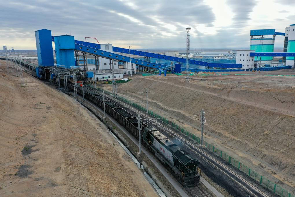 在国能新疆准东能源有限责任公司准东露天煤矿快装站,一列出疆火车在装煤(9月26日摄,无人机照片)。