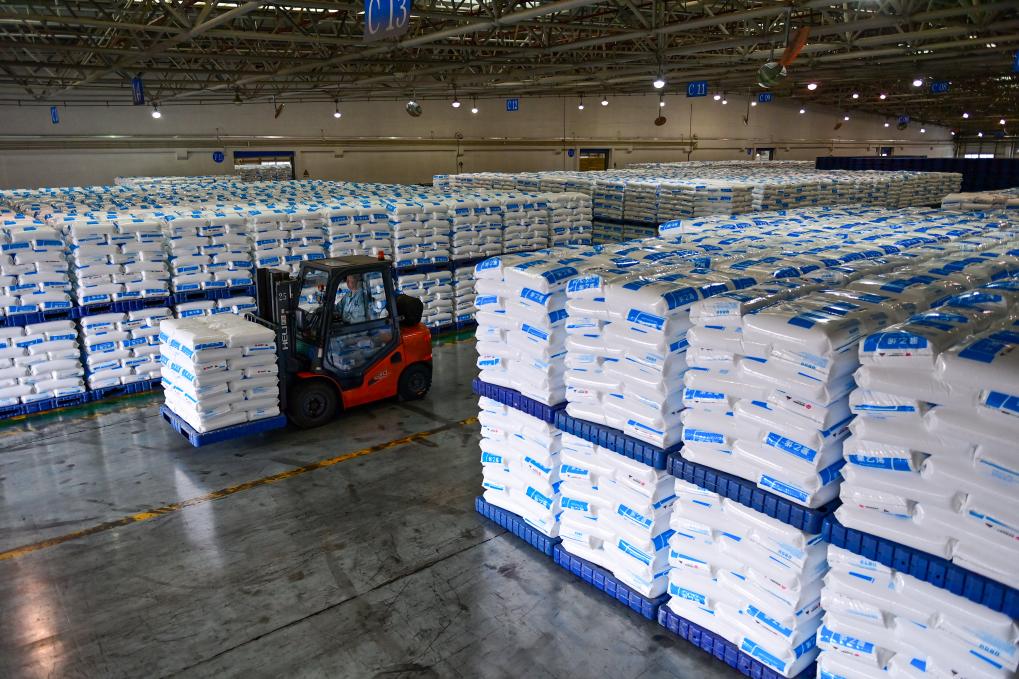 在国能新疆化工有限公司,工作人员驾驶机械运送袋装聚乙烯产品(9月26日摄)。