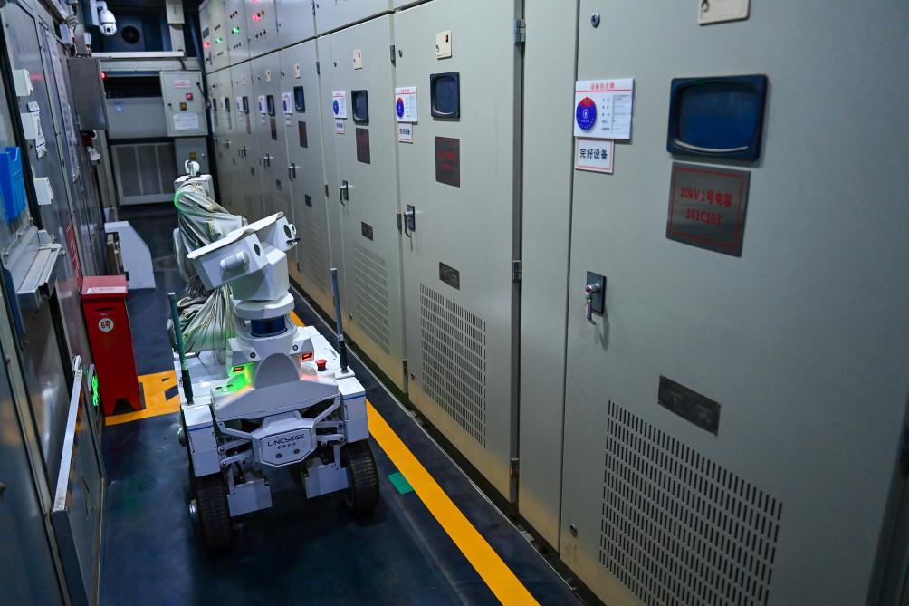在国能新疆红沙泉能源有限责任公司红沙泉煤矿110千伏变电站,机器人在配电室巡检(9月28日摄)。