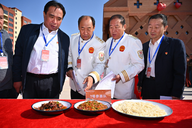 评委对“金牌托克逊拌面”参赛拌面进行评比打分