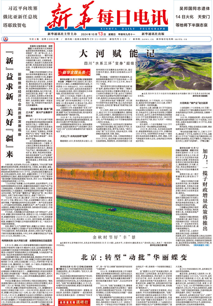 新华社北京10月13日电 10月13日,《新华每日电讯》发表题为《“新”益求新 美好“疆”来——新疆推进经济社会高质量发展观察》的报道。