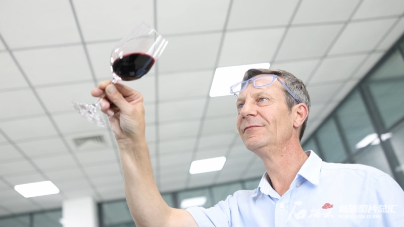 10月5日,中信尼雅葡萄酒股份有限公司法国籍首席酿酒师弗莱德·诺里奥在观察葡萄酒的成色。朱文斌 摄