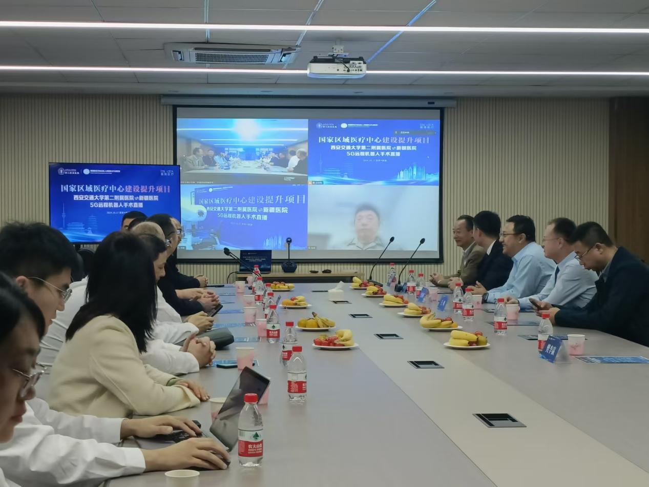 10月17日,国家区域医疗中心建设提升项目启动仪式举行。活动采取主会场分会场联动,线上线下同步进行,主会场设在西安交通大学第二附属医院,分会场设在西安交通大学第二附属医院新疆医院(新疆维吾尔自治区人民医院白鸟湖医院)(以下简称“白鸟湖医院”)。会后,西安交通大学第二附属医院种铁教授及其医疗团队在西安手术室借助5G网络的高速率、低延迟特性,与白鸟湖医院手术室实时连线,进行了一场跨越空间的“面对面”交流,通过国产远程手术机器人成功完成并演示了2台远程前列腺癌根治手术。手术全程进行网络直播,超1.4万人在线观看。