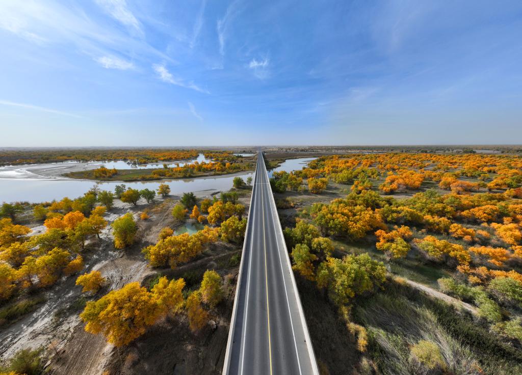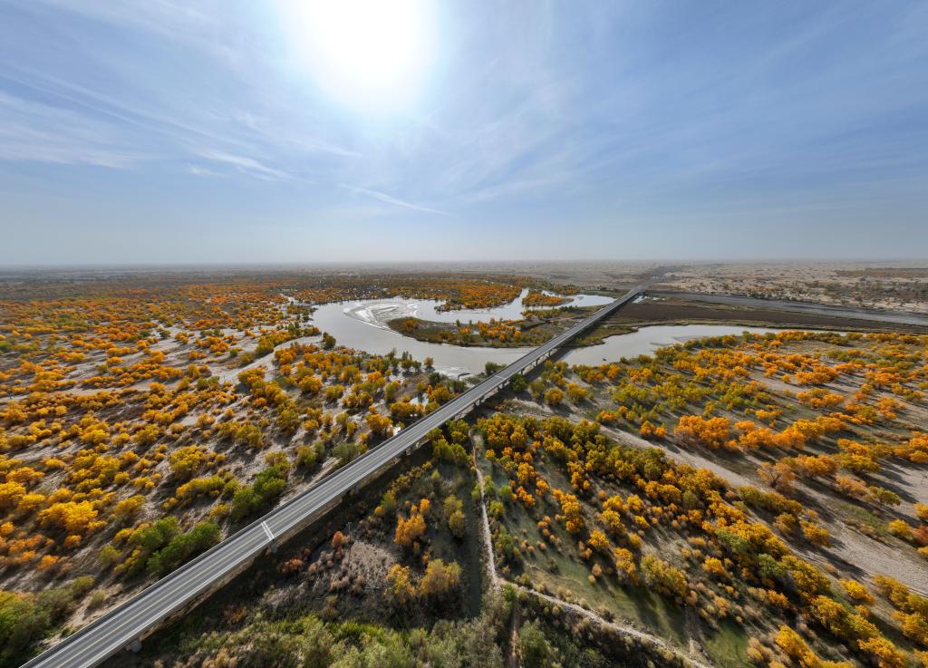 以上图片:2024年10月16日,在新疆塔里木盆地尉犁至且末沙漠公路塔里木河大桥拍摄的湿地胡杨秋色。CICPHOTO/确·胡热 摄