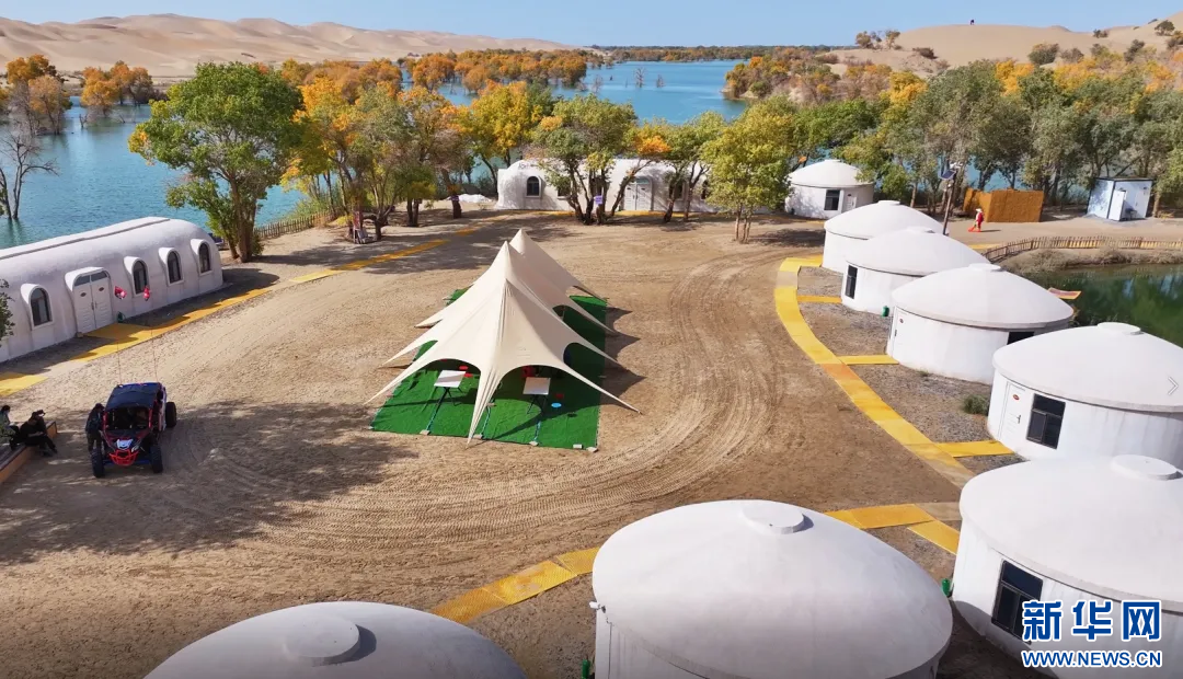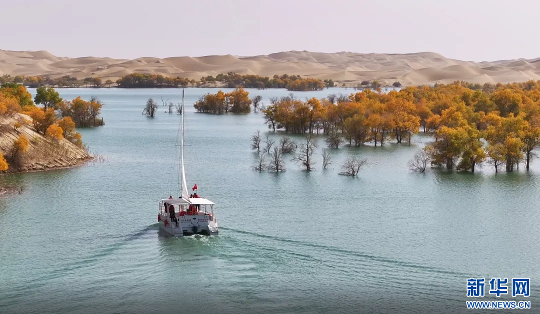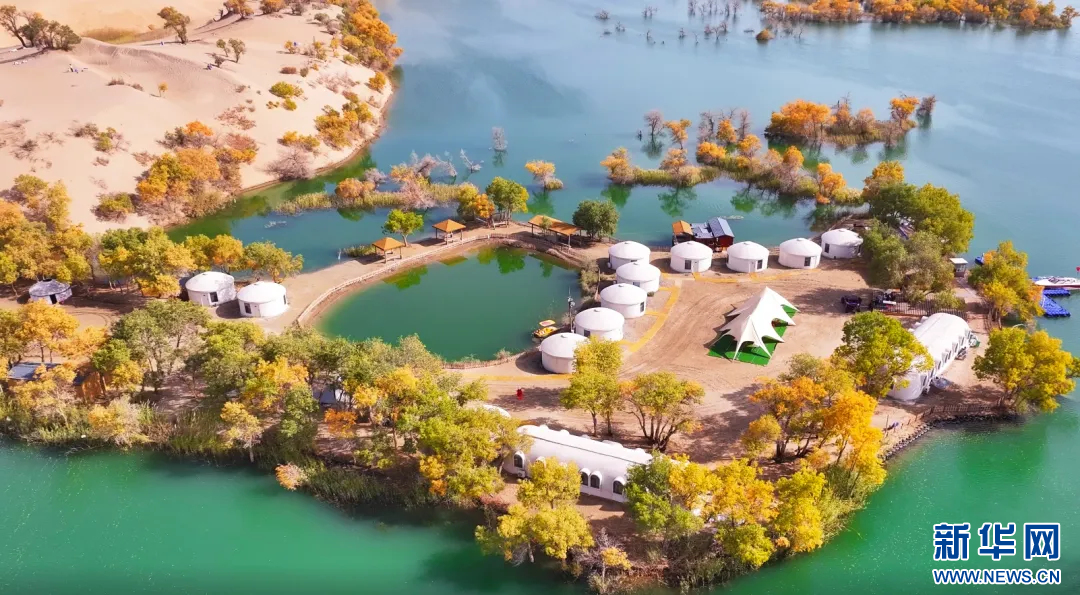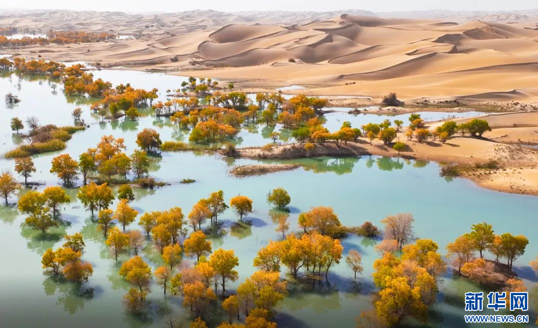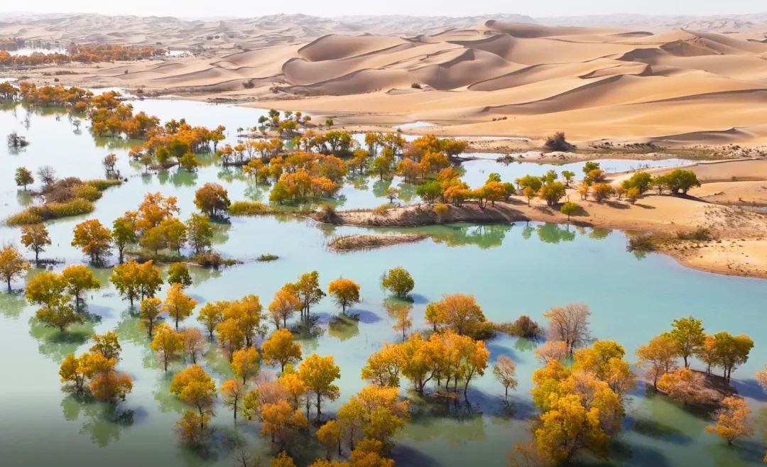 碧绿的湖泊与金色的胡杨、沙丘交相辉映,构成一幅色彩绚丽的秋日画卷。