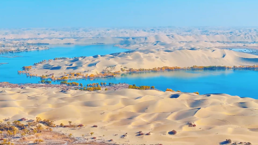 近日,位于新疆铁门关市的胡杨林迎来最佳观赏季,金色的胡杨、湛蓝的湖水、白色的沙丘绘就成一幅绝美画卷。