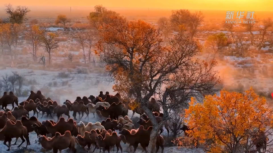 夕阳下,一群骆驼在戈壁滩上悠然自得地漫步,它们的身影在夕阳的余晖中拉长。胡杨树的叶子在秋风的吹拂下轻轻摇曳,仿佛在向过往的行人诉说着古老的故事。