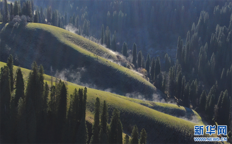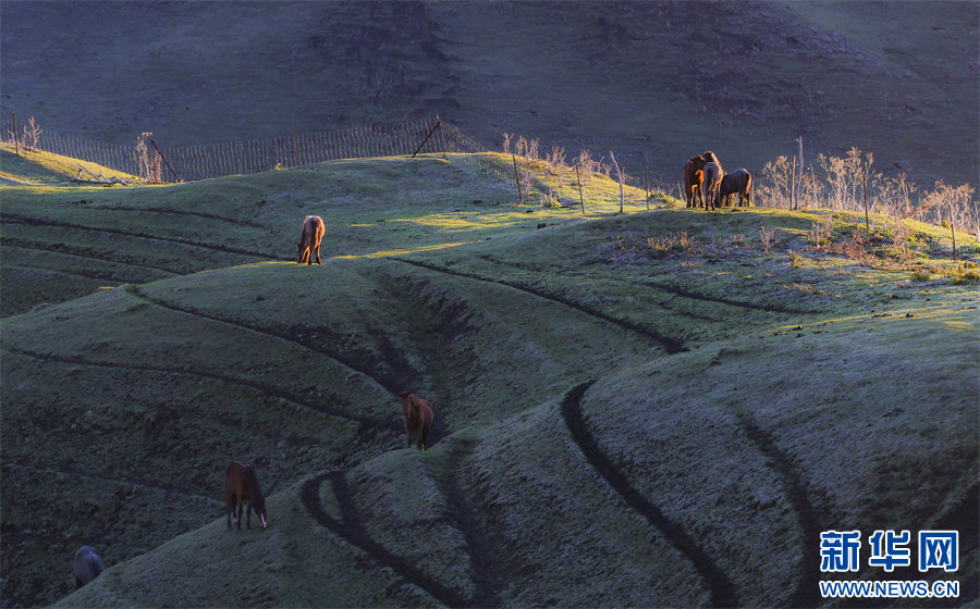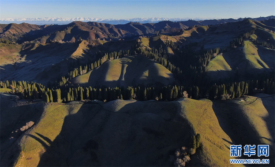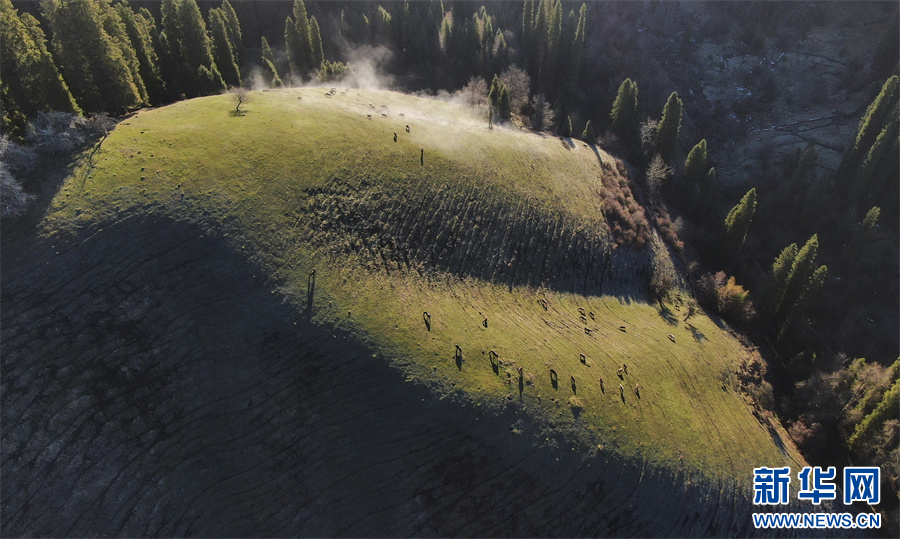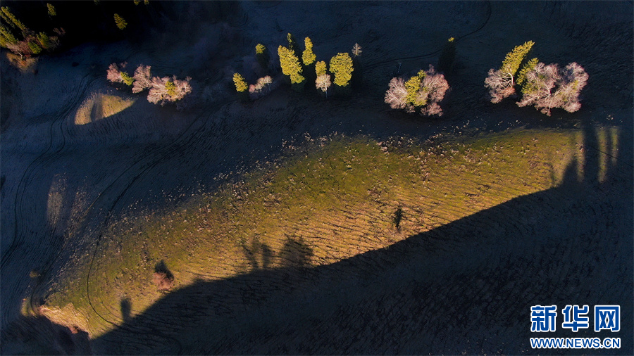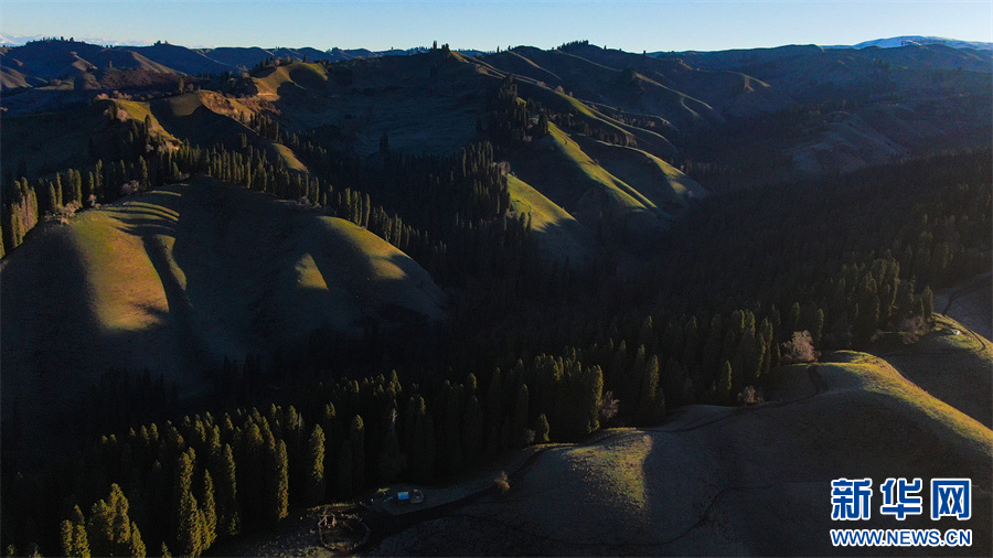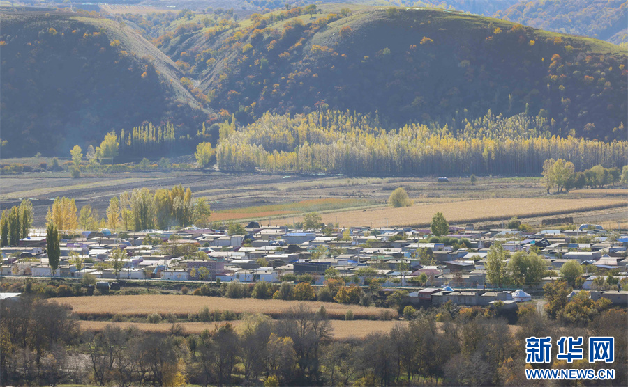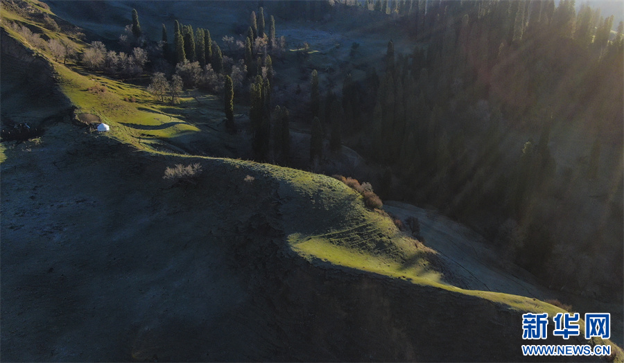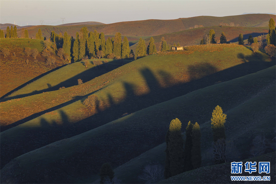 深秋时节,太阳刚刚升起,位于新疆新源县南部的萨哈山区草原逐渐被阳光照亮。由于山区连绵起伏的山势,一时间在山谷形成一幅幅油画般的立体光影画作。光影不断变化,每变幻一个角度,都是不同的影调,美不胜收。村庄周围生长的杨树、桦树、野杏树等树木也披上一层厚重的外衣。