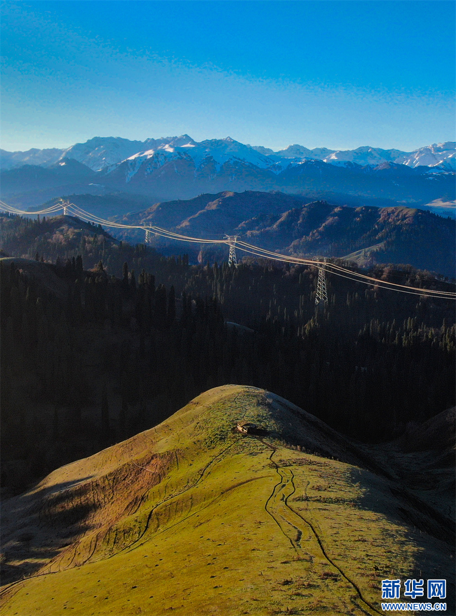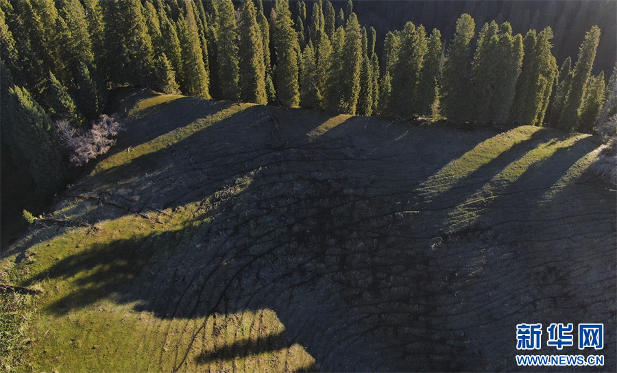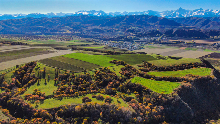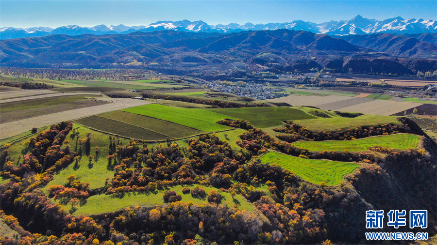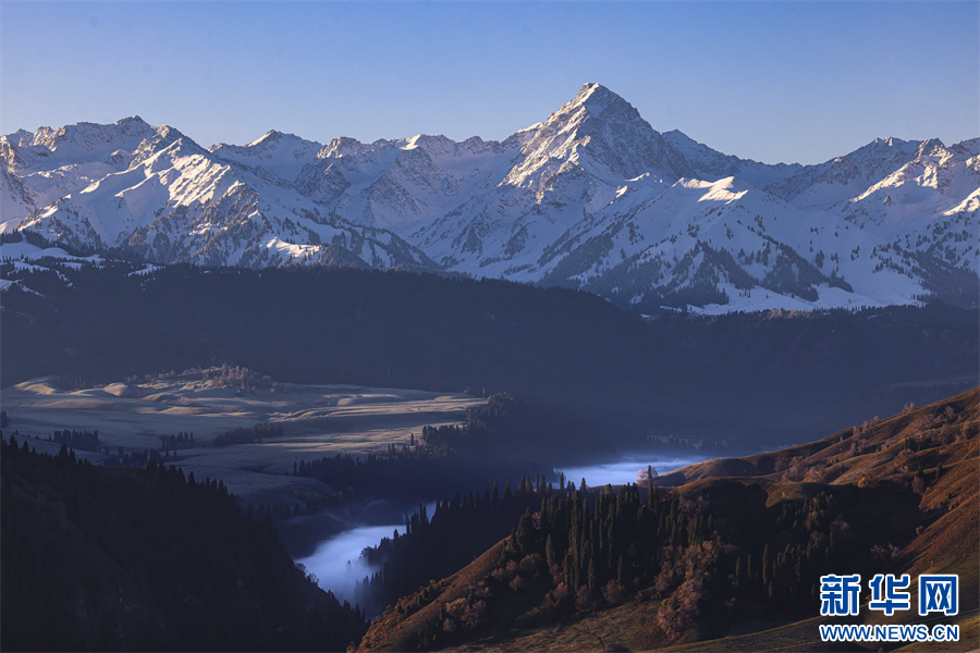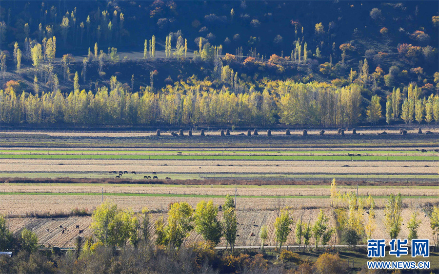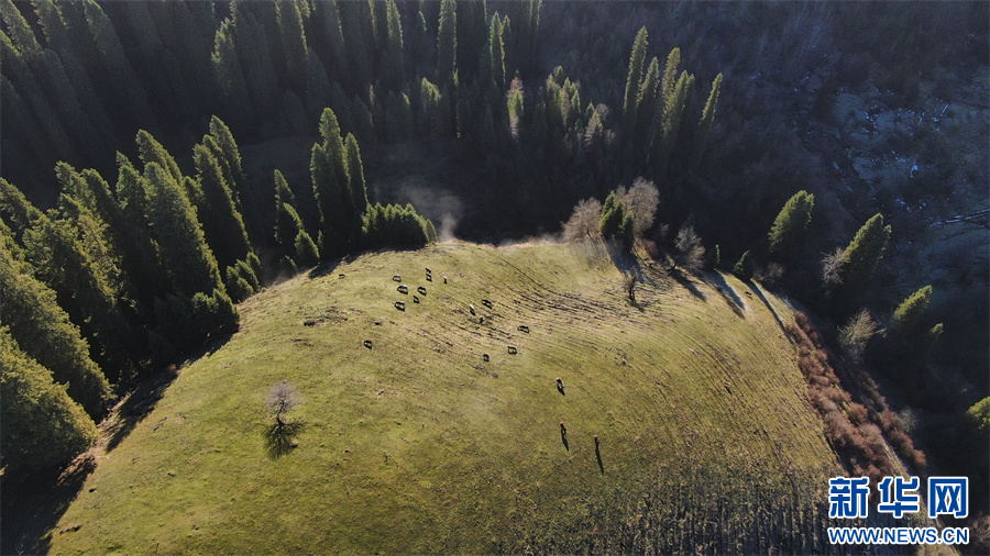 深秋时节,太阳刚刚升起,位于新疆新源县南部的萨哈山区草原逐渐被阳光照亮。由于山区连绵起伏的山势,一时间在山谷形成一幅幅油画般的立体光影画作。光影不断变化,每变幻一个角度,都是不同的影调,美不胜收。村庄周围生长的杨树、桦树、野杏树等树木也披上一层厚重的外衣。