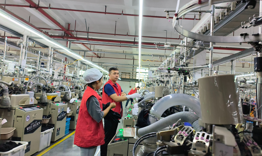 10月29日,在新疆美旭纺织有限公司的生产车间里,工人们正有序进行袜子定型、包装等工序。
