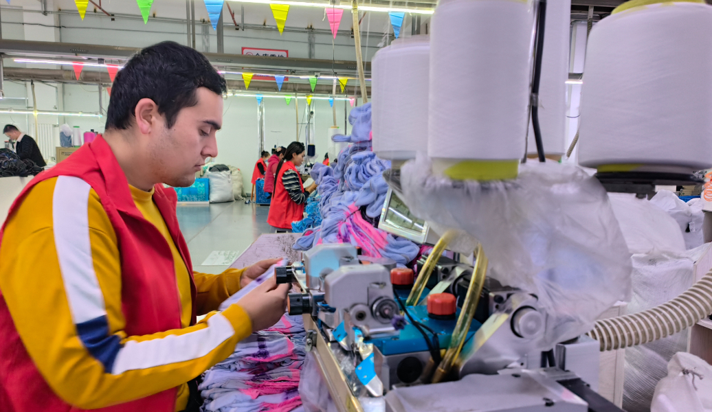 “看这双带有卡通图案的袜子,既可爱又舒服耐穿,欢迎大家在直播间选购!”以织袜厂的生产车间为背景,米热卜拉熟练地向镜头展示手中的袜子,忙着直播带货。该公司现有15名主播在车间带货,每天的订单量高达2000多单。