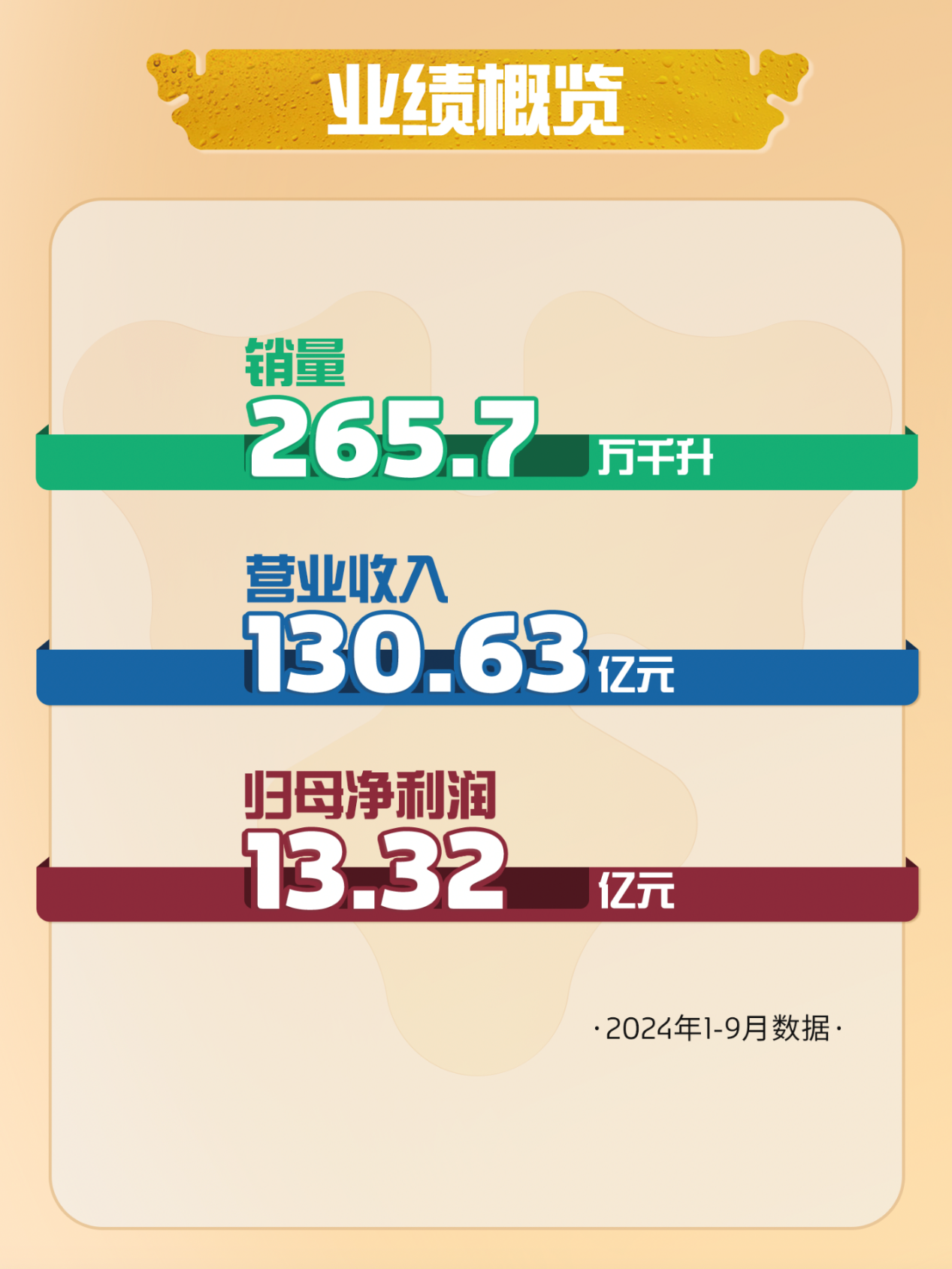 10月30日,重庆啤酒股份有限公司发布了2024年第三季度报告。在中国啤酒行业产量整体下降的背景下,重啤积极应对市场变化和挑战,仍实现了销量增长。1-9月,重啤销量达265.7万千升,营业收入130.63亿元,归属母公司净利润13.32亿元。(周倩)