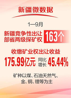 记者从自治区自然资源厅获悉:1—9月,新疆竞争性出让部省两级探矿权163个,收缴矿业权出让收益175.99亿元,同比增长45.44%,矿种以煤、石油天然气、金、铜、锂等为主。