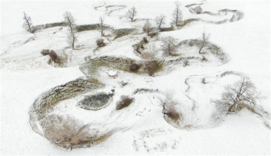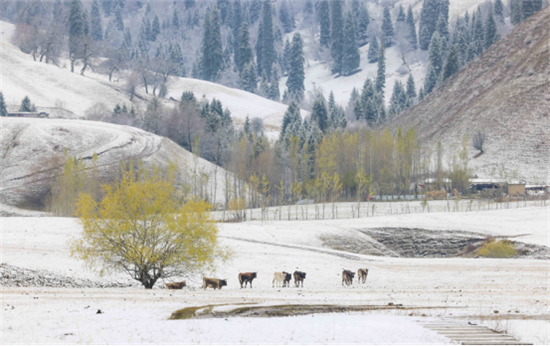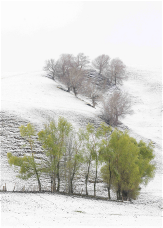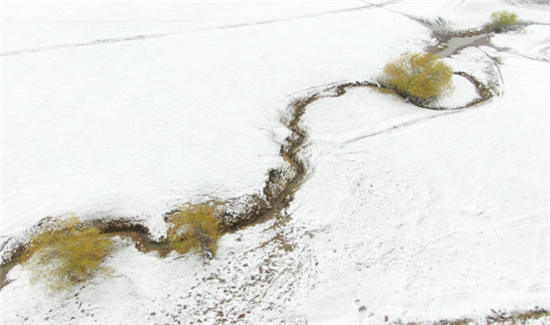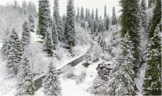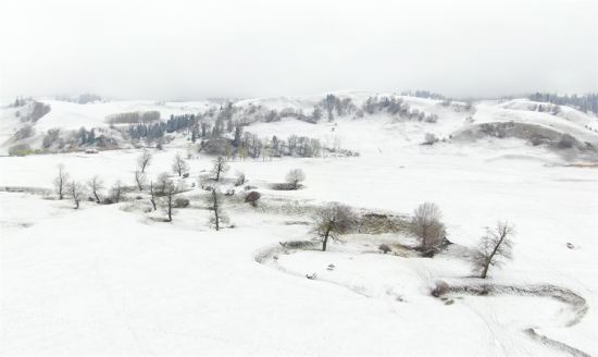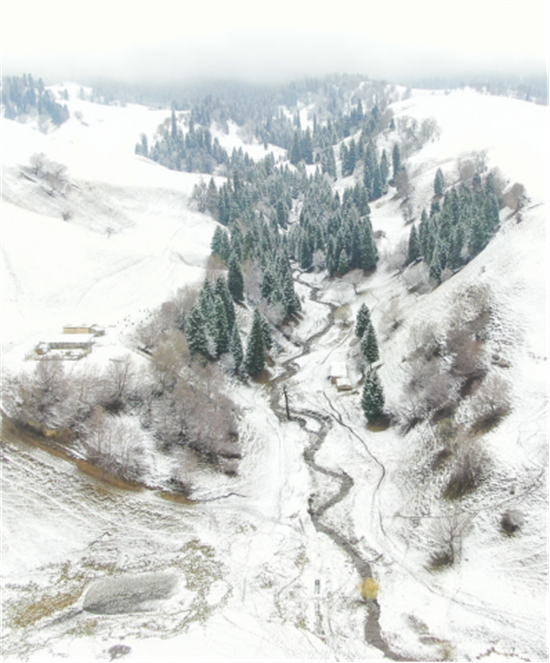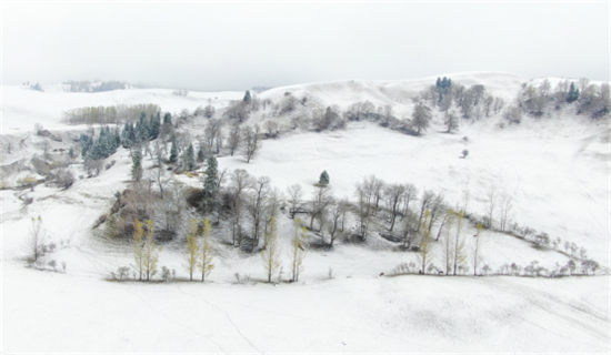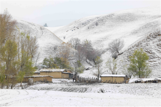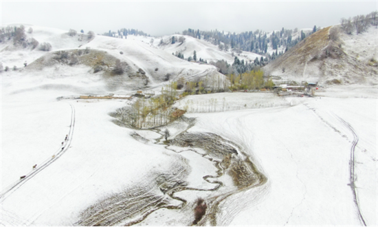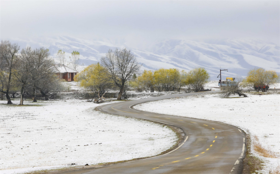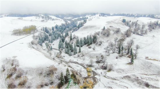 秋冬之交的那拉提草原,金秋的斑斓还没有褪尽,薄薄白雪已悄然飘落,秋黄和白雪交相辉映,完美结合,充满和谐美感,形成一种奇特而美丽的秋雪奇观。