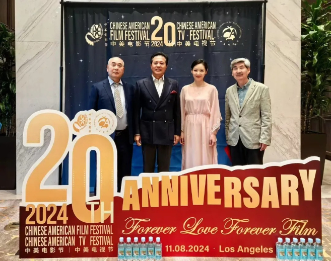 参加中美电影节的《父亲在远方》主创人员合影。左起:赵杉(影片总监制)、佟瑞欣(上海电影演员剧团团长,影片中饰演姜万富)、王维维(影片中饰演姜欣)、姚国铭(影片总制片人)