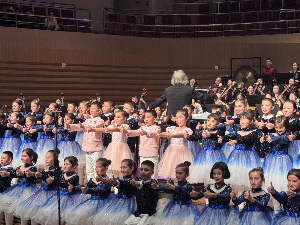 来自新疆本土的演奏家也轮番登台,倾情献上了《博尔塔拉风光》《梦回克孜尔》《楼兰意象》等一系列新疆民族乐曲。这些曲目不仅旋律悠扬、动人心弦,更将新疆的壮丽风光与深厚历史巧妙地融入其中,用音乐的语言描绘出一幅幅丝绸之路上的绝美画卷,让听众在悠扬的旋律中仿佛亲身游历了这片神奇的土地。在演出尾声,活泼可爱的儿童合唱团携手众多技艺精湛的演奏家,共同演绎了一曲欢快的新疆民歌《亚克西》。悠扬的歌声,展现了新疆人民的热情与好客,也传递出对美好未来的无限憧憬与向往。