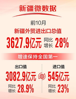 前10月,新疆外贸进出口总值3627.9亿元,同比增长28%,增速保持全国第一。新疆外贸规模创历史同期新高,提前2个月超2023年全年水平。