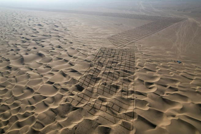 “与流沙赛跑,必须阻沙、固沙双管齐下。”中铁建发展集团承担了新疆和田地区民丰县35公里锁边固沙任务,该项目负责人朱开封介绍,他们通过高立式沙障、草方格、宽林带三道防线构建起“固沙+阻沙”综合防治体系。