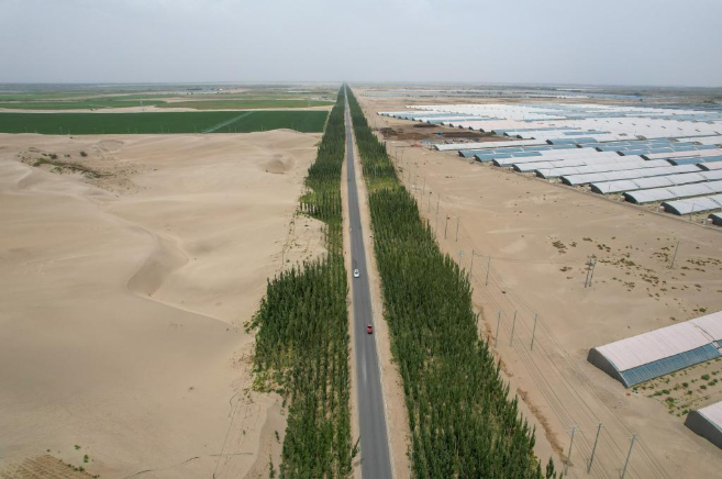 今年以来,新疆把补齐285公里“缺口”作为塔克拉玛干沙漠边缘阻击战的重点,因地制宜、分类施策,综合采用工程固沙、生物治沙、光伏治沙等科学治沙技术,在固沙阻沙的同时,大力发展具有地方特色的沙产业,助力惠民富民。