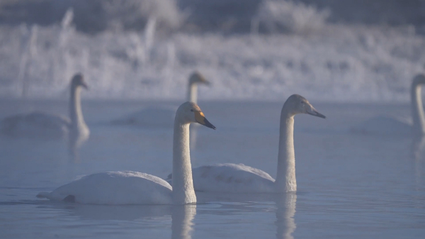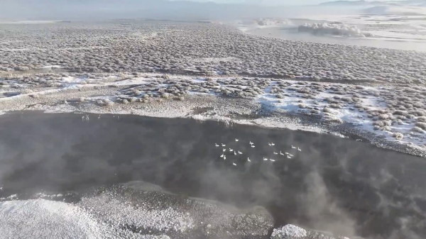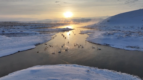 初冬时节,在新疆伊犁哈萨克自治州昭苏县湿地公园,数十只越冬天鹅在雾气蒸腾的河面嬉戏、觅食。水雾里,身姿优雅、体态婀娜的天鹅,或轻盈踏水,或翩翩起舞,成为一道亮丽的风景。