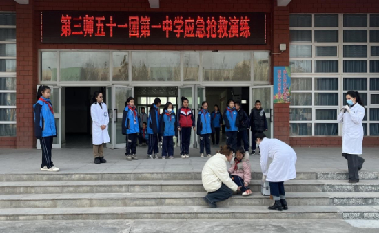 当日在五十一团第一中学开展的应急抢救演练模拟学生楼梯摔倒骨折场景,校医与师生迅速响应,在紧张救援中学习急救要点。