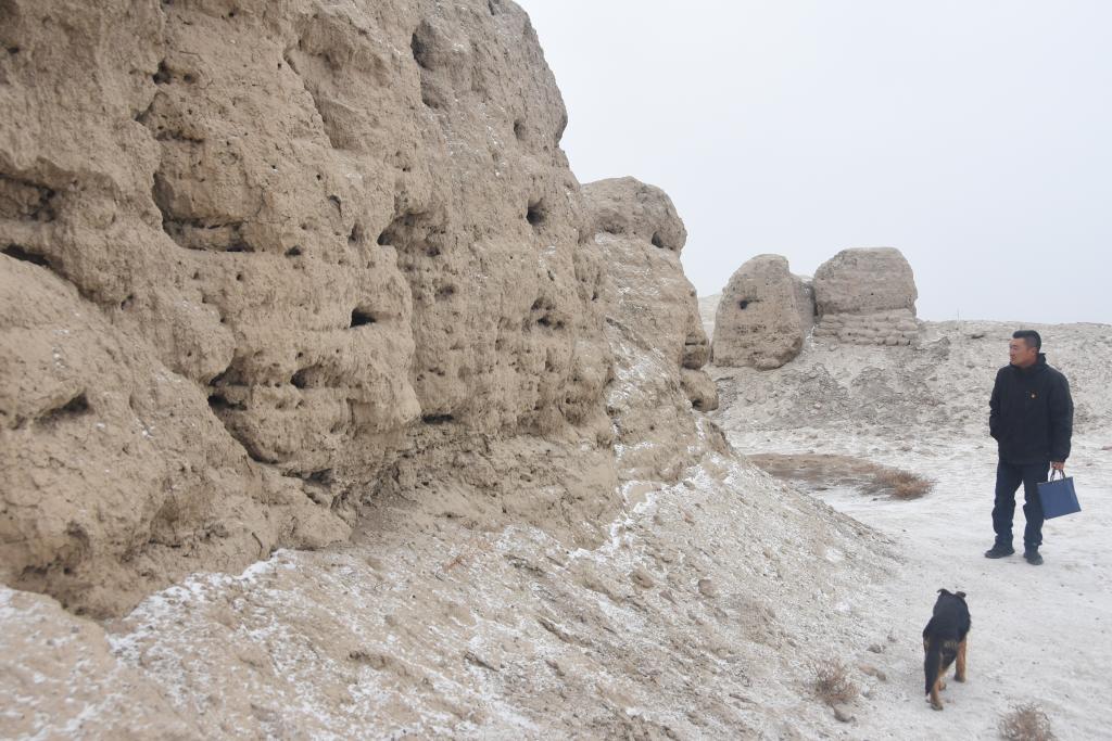 冬日的新疆博乐市达勒特镇查干苏木村,46岁的文保员赵勇像往常一样,带着小狗“黑狼”巡护达勒特古城遗址。达勒特古城遗址有内、外两重城墙,城内至今存有土坯建筑,也有浴场等砖构建筑,2013年成为全国重点文物保护单位。